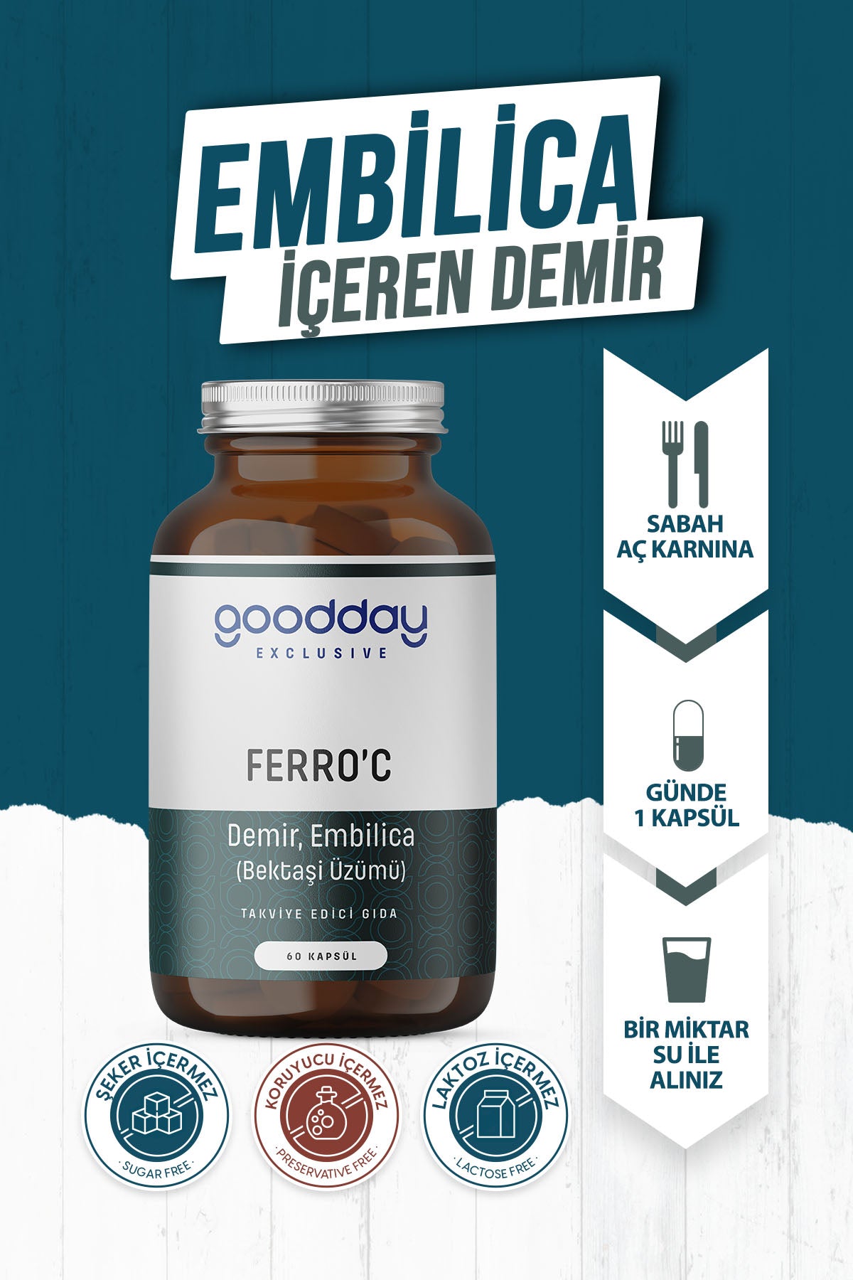 İçindekiler: Rosa canina L. (Kuşburnu Ekstresi), Embilica Officinalis Gaertn (Bektaşi Üzümü Ekstresi), Bitkisel Kapsül (Hidroksi propil metil selüloz), Demir Bisglisinat, Topaklanmayı Önleyici (Yağ asitlerinin magnezyum tuzları)